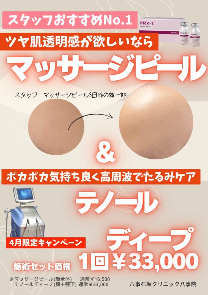 4月限定で『マッサージピール』とたるみ治療の痛くない高周波『テノールディープ』のセット割引キャンペーンを実施中です♪